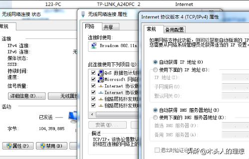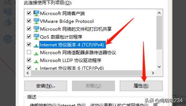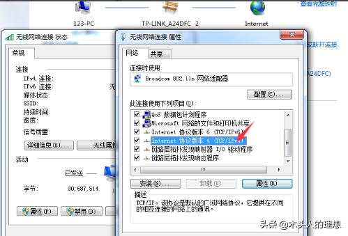 第四步、查看完之后再返回之前窗口,点击属性,进入到无线网络连接属性窗口,点击Internet协议版本(TCP/IPV4),再进入属性界面。