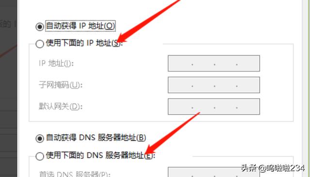 7、在更改IP地址的窗口,默认是自动获取ip地址,在【使用下边的IP地址】选项前面的圆圈点击选中,颜色就变了,这时可以手动输入ip地址,输入好需要的IP地址和DNS后点击【确定】按钮。
