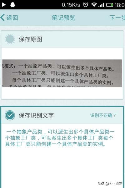4、等待一小会,手机自动识别完图片上的文字后,显示在下方。如果图片清晰的话,准确率还是很高的的。确认文字无误后,点击“下一步”。