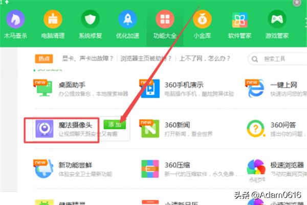 然后点击 功能大全 ;在打开的页面中找到 魔法摄像头 ,点击 添加 之后,也可以打开。