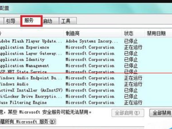 14.此时,显示的都是外来软件的服务,可以全部禁用!再次重启操作系统,看问题是否解决了,如正常了,那就是启动项和服务的缘故,彻底禁用即可。