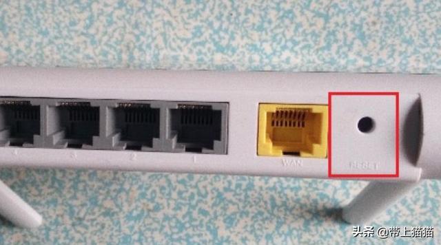 在360路由器的机身上,有一个复位按钮:RESET,如下图所示。在插上电源的情况下,使用牙签、笔尖等尖状物体,一直按住RESET按钮不松开。然后注意观察360路由器上的指示灯,当所有指示灯熄灭并重新闪烁时,说明恢复出厂设置成功,这时候可以松开复位按钮了。