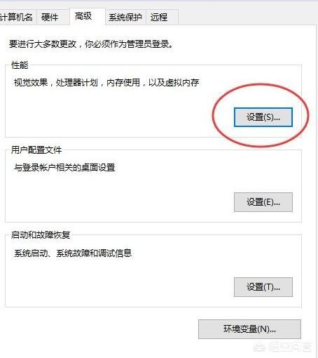 2.在打开的系统属性页面中,点击性能下方的“设置”按钮