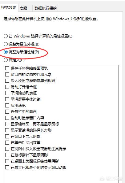 3.这时系统勾选的是“调整为最佳性能”,你可以选择其他选项,也可以自定义你需要的视觉效果,最后点击确定即可。