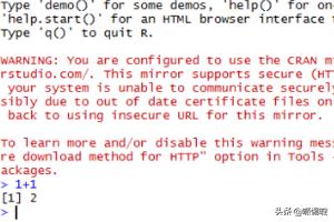 7、安装完成后,我们就可以使用RStudio工具了,我们在左侧的控制台进行操作,比如我们输入1+1,会输出2。