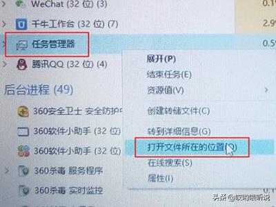 2、在“任务管理器”中找到打开的弹窗程序。一般情况下,“任务管理器”中的名称与弹窗名称是一样的。因我的电脑已经将弹窗都清除了,所以就以“任务管理器”为例。在名称上右键,点“打开文件所在的位置”。