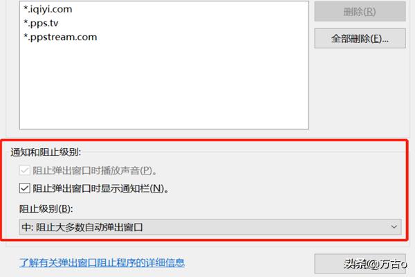 5、勾选【阻止弹出窗口时显示通知栏】,将阻止级别设置为【中:阻止大多数自动弹出窗口】