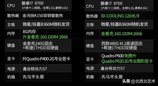 图中左右2种配置,做设计用够了,图左配置约5000元,图右配置约5700元,配件更新换代速度较快,仅供短时间参考。