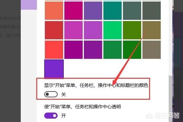 4、接下来,我们现将页面转到颜色设置页面最底端,将“显示开始菜单、任务栏、标题栏颜色”的开关打开,该开关默认处于关闭状态,对于处于关闭状态的开关,窗口颜色将默认是不开启的。