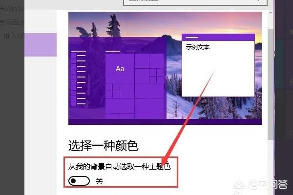 5、接下来,我们可以对窗口颜色分别做一个简单的设置。在颜色设置页面顶端,我们可以看到“从我的背景自动选取一种主题色”设置开关,如果你不想手动设置颜色的话,可以点击开启该开关,窗口颜色即可自动设置。