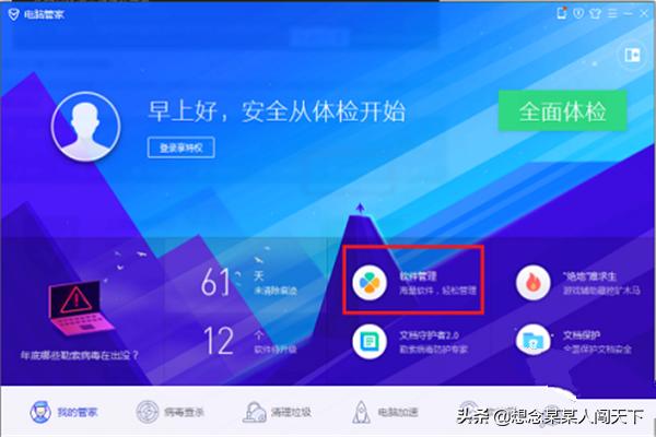 5.此外我们可以借助第三方软件卸载,卸载的干净彻底,腾讯电脑管家这个软件,里面有一个软件管理功能。